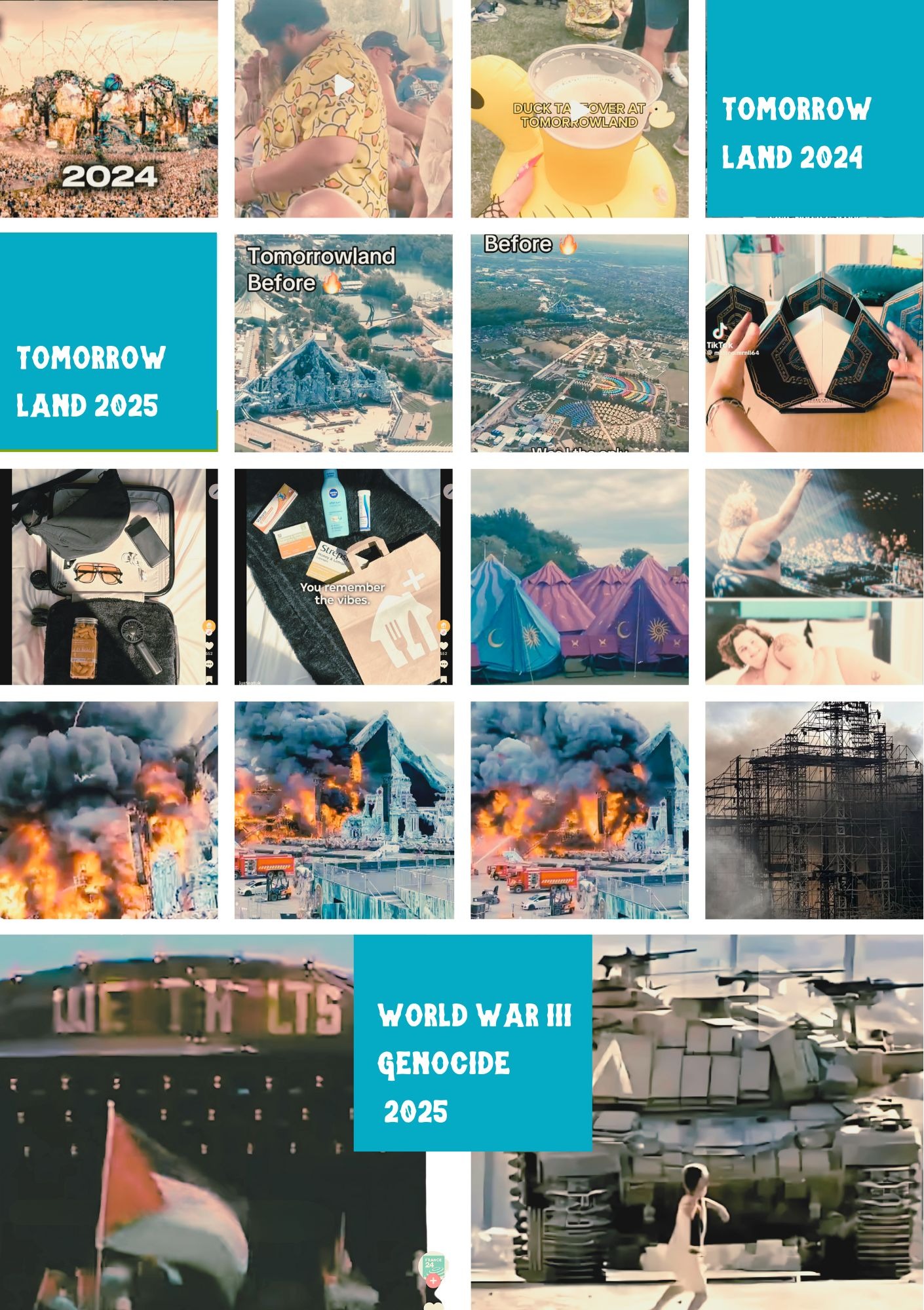 Cue Rammstein’s "Feuer Frei". Let the guitars crunch while the rigging collapses. Let the flames lick the corporate fairy lights. Let the fireworks that were meant to distract from genocide instead illuminate it. The symbolism is perfect: a hollow empire of LED panels and confetti cannons reduced to carbon and twisted steel. No casualties, just a monument to vacancy.